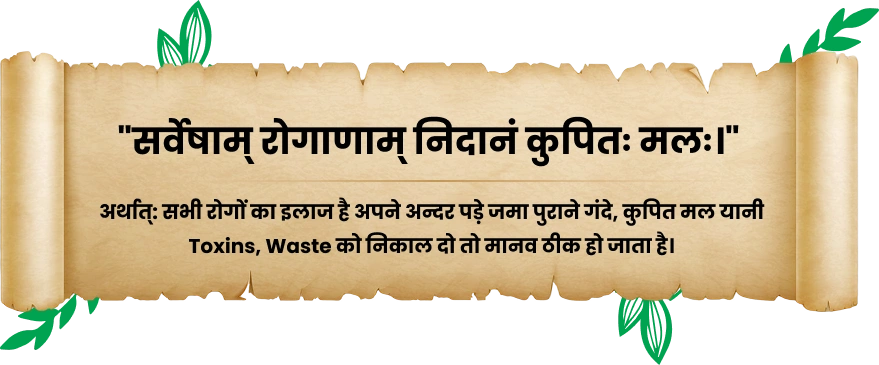 आयुर्वेद के अनुसार सभी रोगों की जड़, अंदर पड़ा कुपित मल होता है। जब जठराग्नि धीमी पड़ जाती है, तो हम जो भोजन करते हैं वह सही तरीके से पच नहीं पाता। इससे पेट में विषैले तत्व जमा होने लगते हैं, जो धीरे धीरे अनेक बीमारियों का कारण बन जाते हैं। हालांकि, आयुर्वेद आहार, विहार, शमन और शोधन की सहायता से इनमें से अधिकांश रोगों को ठीक करने की क्षमता रखता है।