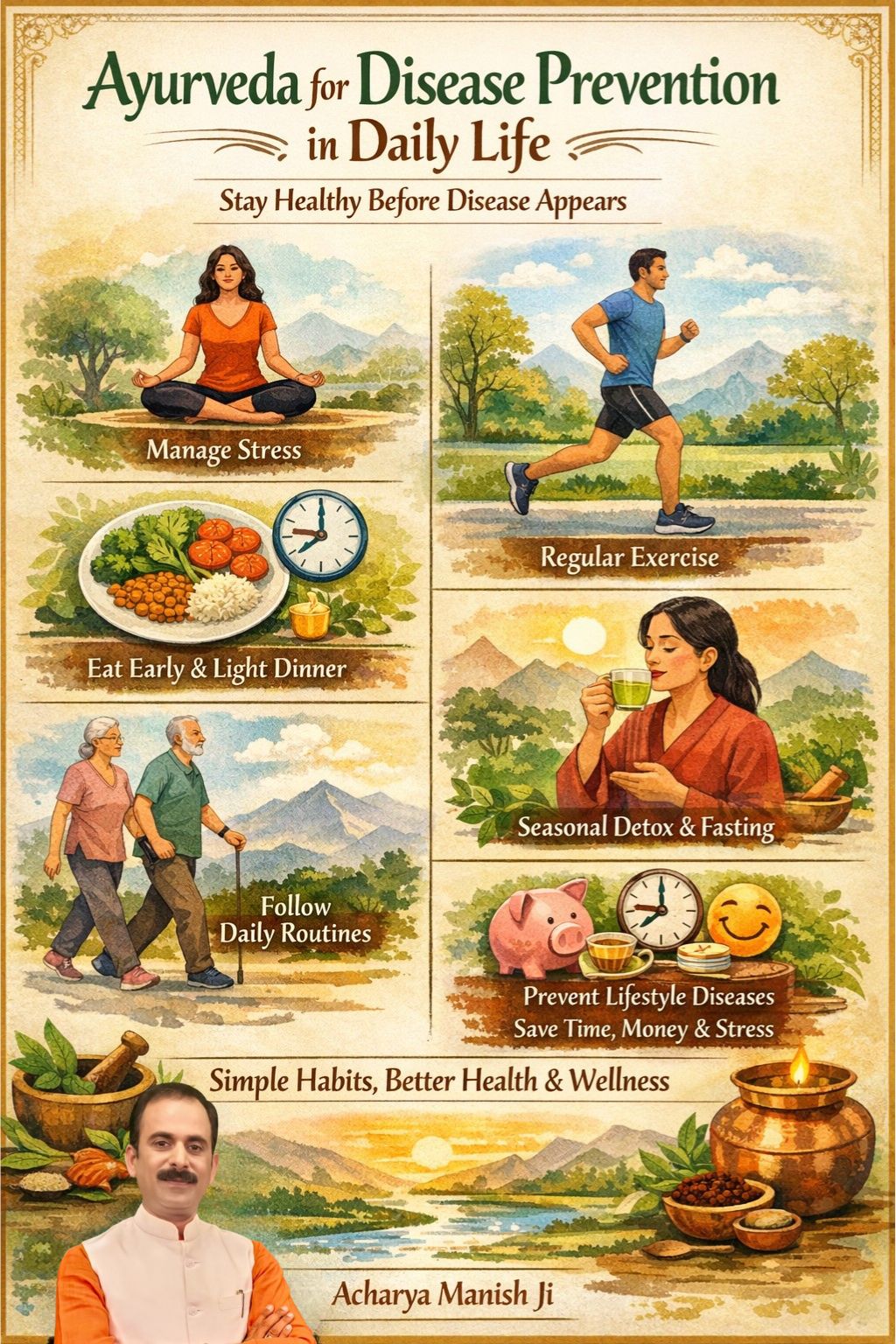 Simple habits matter more than people realise. Eating an early and light dinner, fasting when advised, regular physical activity, and managing stress are basic Ayurvedic principles explained by Acharya Manish Ji. Seasonal routines and mild detox practices help the body adjust to weather changes and reduce illness.