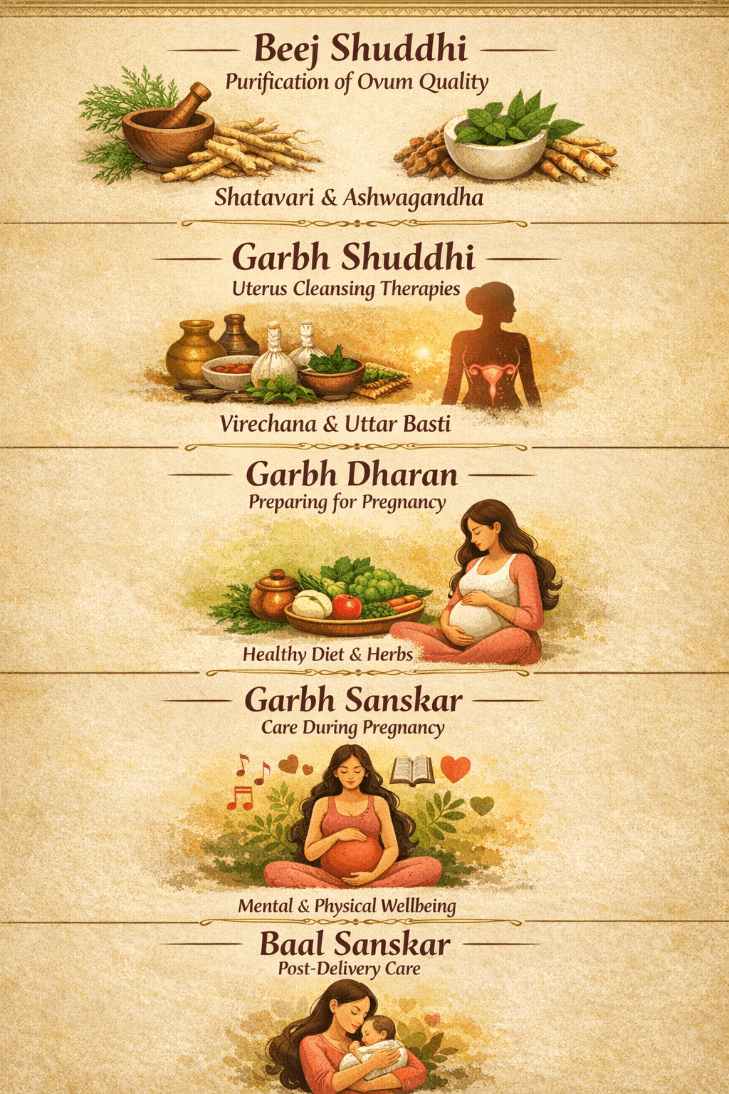 Garbh Shuddhi – cleaning and preparing the uterus with therapies like Virechana and Uttar Basti.